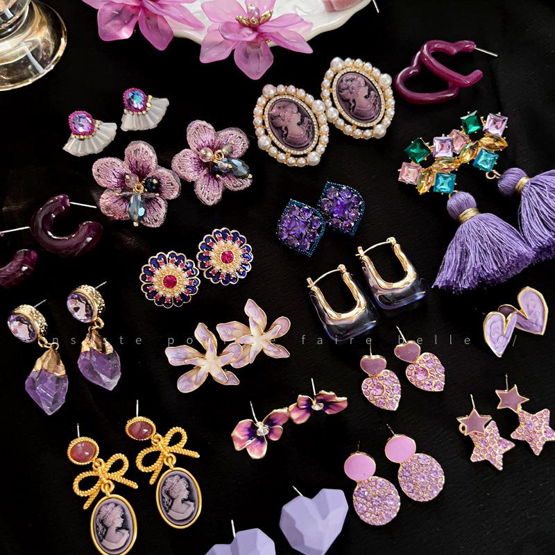 Retro Lila Blume Diamant Quastenohrringe - Silbernadelstecker für elegante Frauen