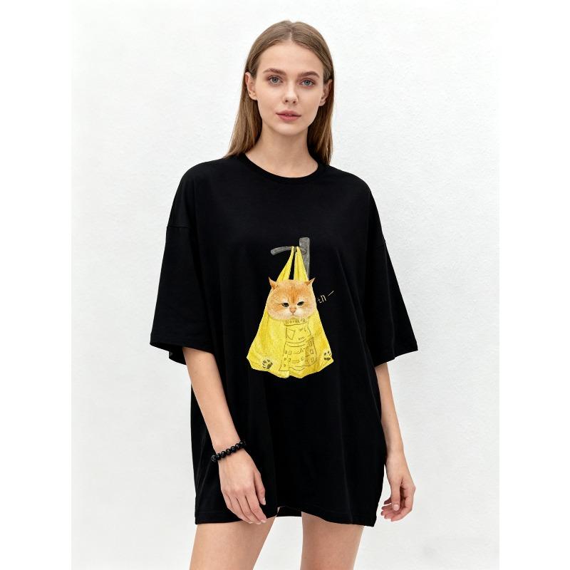 Übergroßes T-Shirt Schwarze Katze in gelber Tasche Print Lässige Alltagskleidung