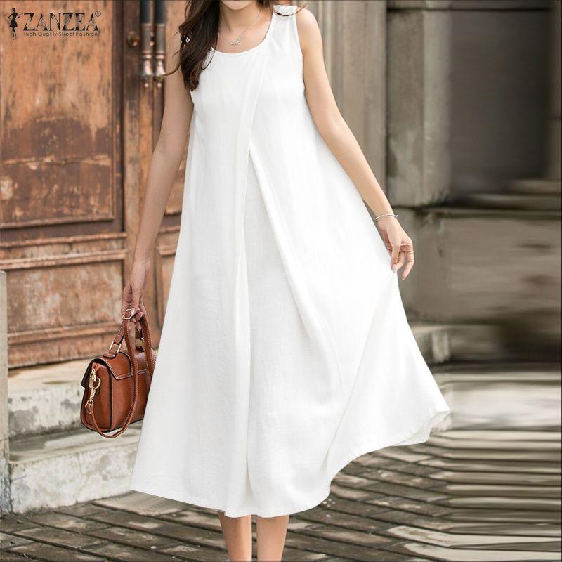ZANZEA Women Round Neck Summer Casual Sleeveless Dress