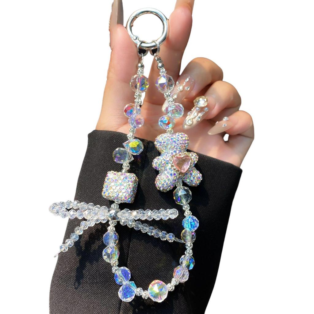 Luxus-Kristallbär Rosa Handy-Kette mit Herz, Schleife und Perlen-Anhänger
