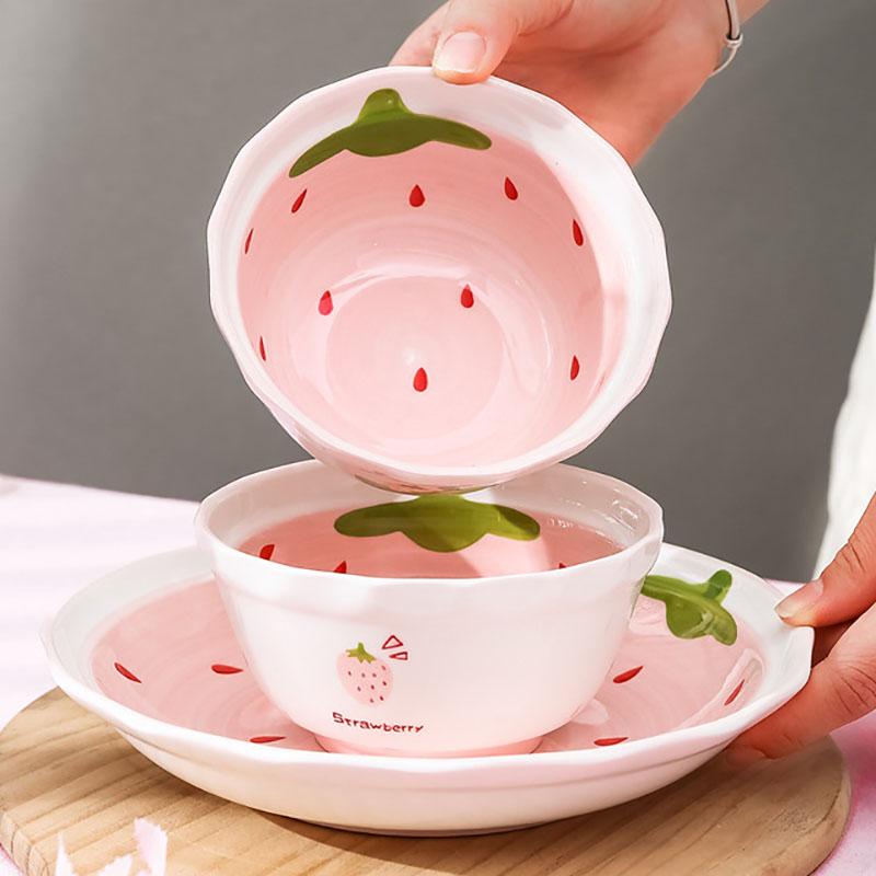 Pink Strawberry Plate Rectangular Ceramic Western Steak Plate Round Fruit Dessert Bowl Noodle Soup Large Bowl Breakfast Milk Mug