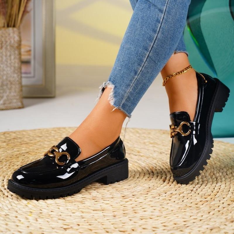 Women's Patent Leather Slip-On Loafers, Round Toe Thick Sole Flats, Plus Size Fashion Shoes