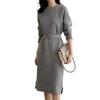 J-Scott Puffärmelkleid mit Schärpengürtel, Midilänge, 3/4-Ärmel, Rundhalsausschnitt, I-Linie, Schönes Grün-Grau, JS82-GY-M