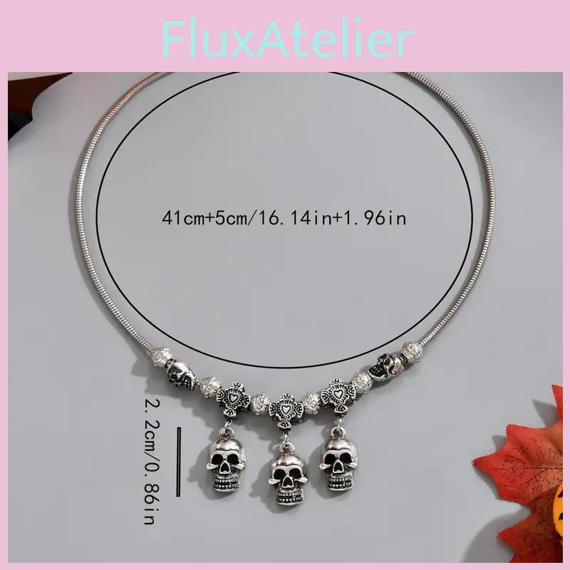 Diese Halskette im Dark-Style verfügt über ein geometrisches Legierungsdesign mit einem Anhänger in Form eines Skelettkopfes und Quastenakzenten und ist ein auffälliges Kostümaccessoire.. Gefertigt aus langlebiger Legierung mit Galvanisierung. Ideal für Halloween-Partys oder Veranstaltungen mit Gothic-Thema, es wertet jeden Kostüm-Look auf. Pflegeleicht, mit einem feuchten Tuch abwischen für langanhaltenden Tragekomfort.