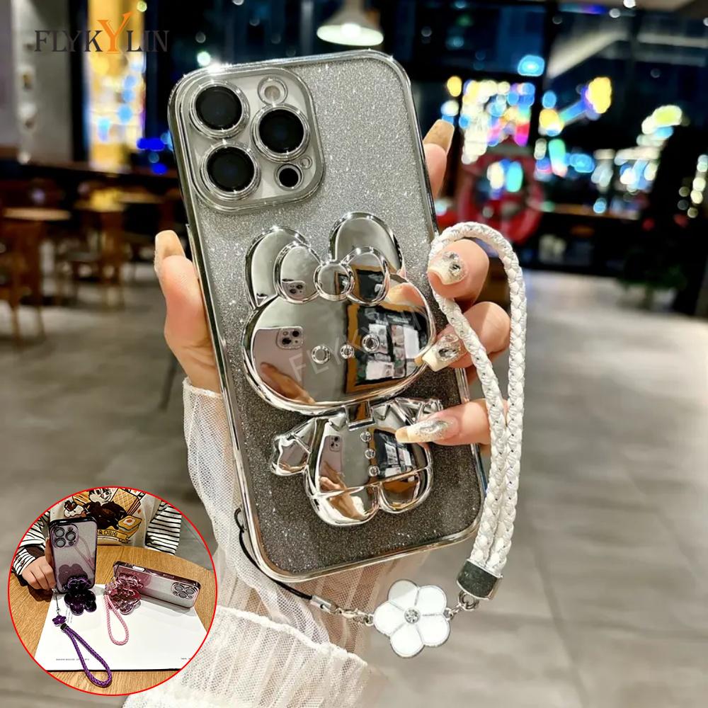 Luxury Glitter Rabbit Mirror Phone Case For Honor 200 90 100 80 70 60 50 Pro SE 20 30 Pro Four Leaf Clover Hand Rope