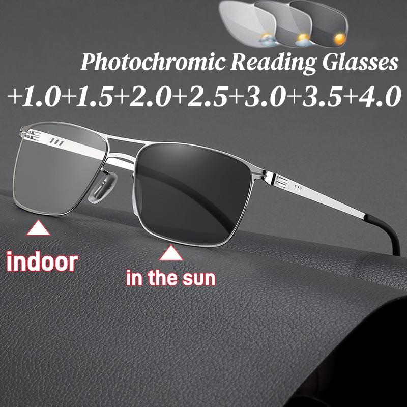 Retro Doppelsteg Metall Photochrome Lesebrille Vintage HD Anti Blaulicht Ultraleicht Herren Business Alterssichtigkeit Brille