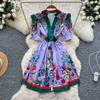 Sommer Damen Vintage Print Laufstegkleider V-Ausschnitt Einreihig Mini Kurz Partykleid