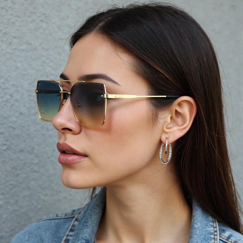 Vintage Square Double Bridge Sunglasses For Women With Golden Metal Frame And Chain Decoration Light Luxury Women Glasses