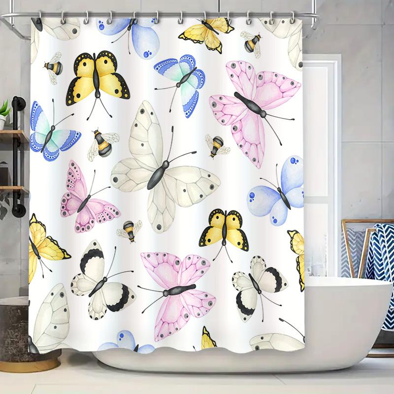 Aquarell Schmetterling Duschvorhang Set, Wasserdichter Stoff, Dekorative Badezimmer Wandbehängung Gelb, Rosa, Blau, Weiße Farben In
