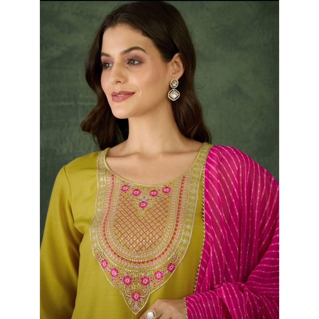 Damen Rayon Bestickter Gerader Kurta mit Hose und Dupatta Sets
