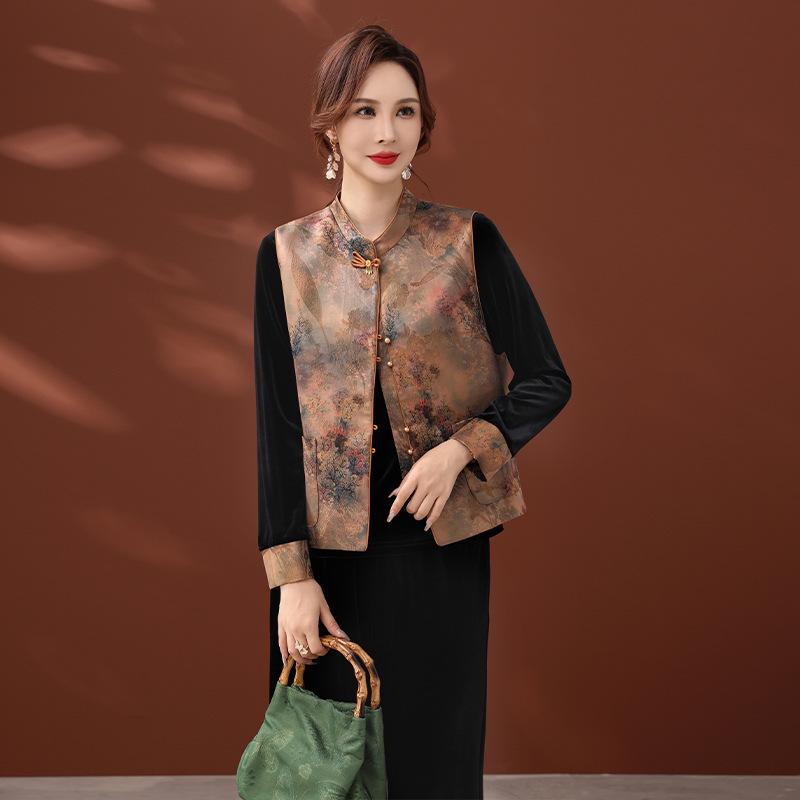 Dieses elegante Westen-Set ist speziell für Frauen mittleren und höheren Alters entworfen und kombiniert traditionellen chinesischen Stil mit modernem Komfort.. Die ärmellose Jacke ist mit einem luxuriösen goldenen Samtfutter gefüttert, das sowohl Wärme als auch Raffinesse bietet.. Gefertigt aus hochwertigem Polyestermaterial, garantiert diese Weste Langlebigkeit und eine bequeme Passform, was sie zu einer idealen Wahl für sowohl die Frühlings- als auch die Herbstsaison macht.. Perfekt, um Alltagsoutfits einen Hauch von Klasse zu verleihen.