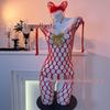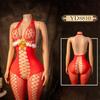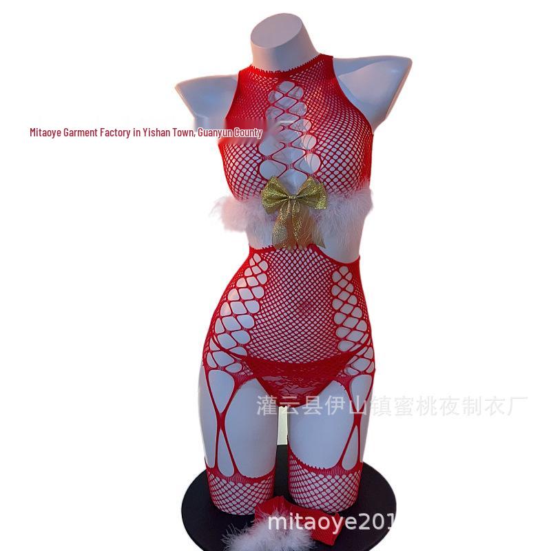 Golden Bow Christmas Cutout Fishnet Lingerie - Sexy, Fuzzy, Open Crotch Red Stocking for New Year