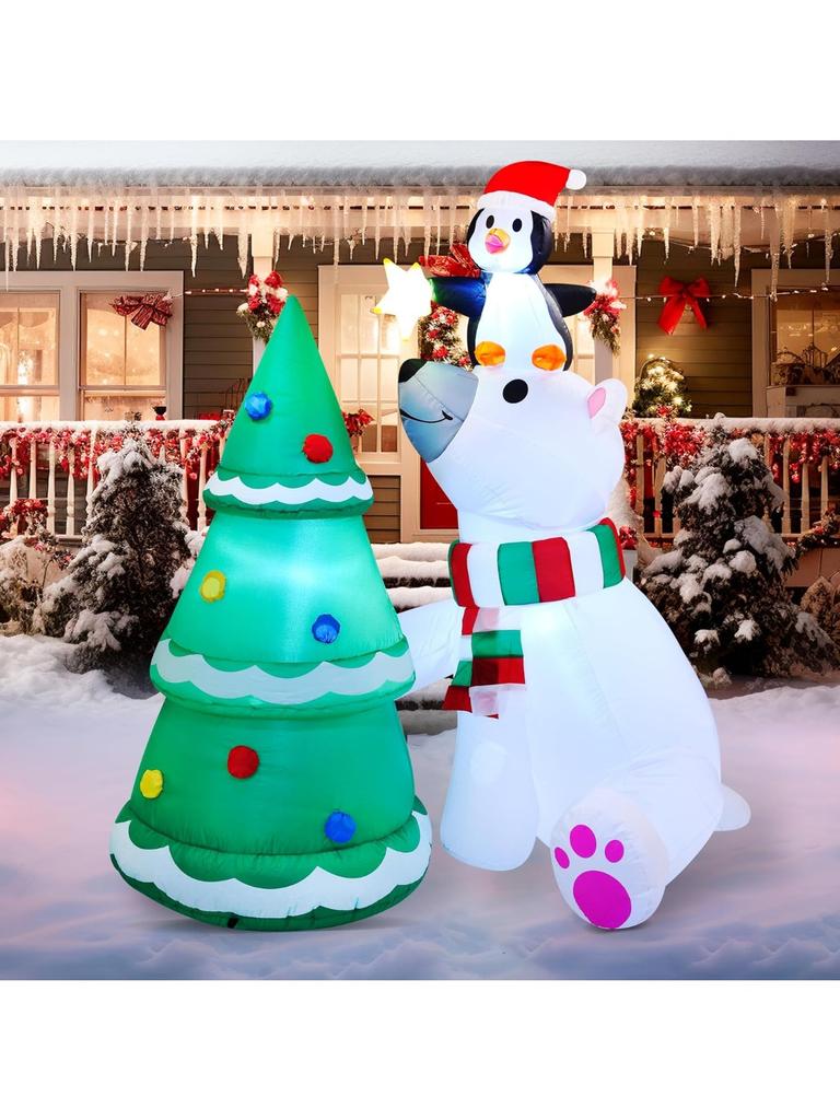 JOYFY 6 ft Christmas Polar Bear Inflatable Decoration with Penguin & Xmas Tree Décor for Christmas Party Yard Winter Decoration