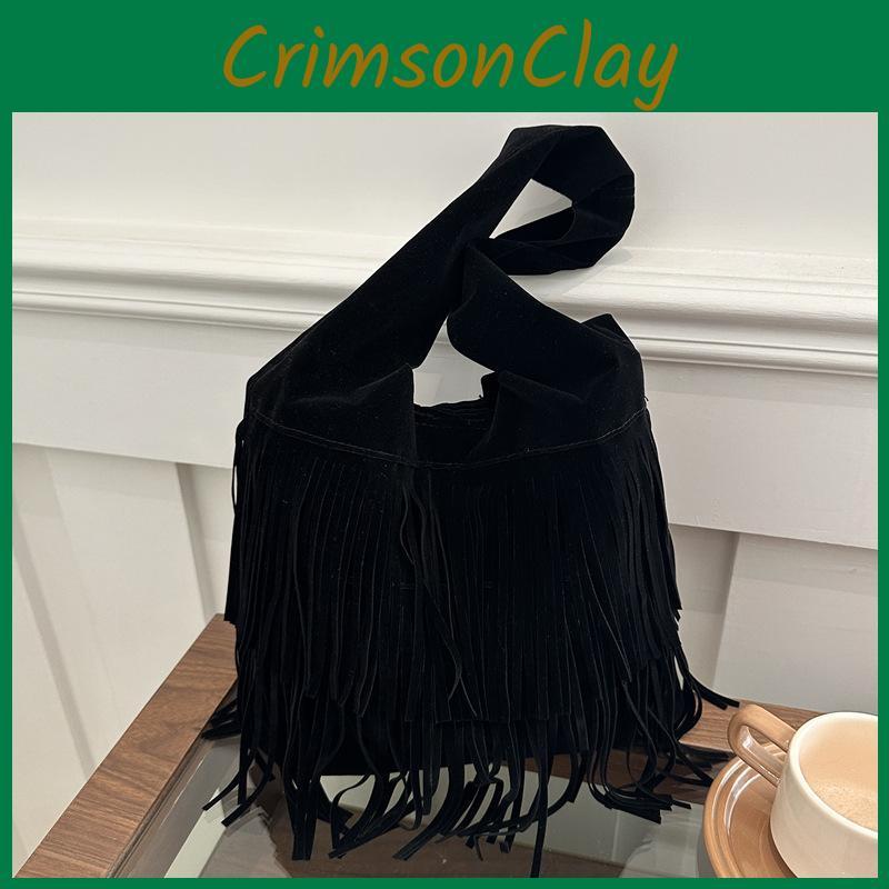 The Bohemian Fringe Tote Bag combines urban simplicity with practical design, making it an ideal accessory for daily use. Crafted with a unique material, this medium-sized bucket bag features a magnetic closure for secure access and a single shoulder strap for comfortable carrying. Its structured exterior includes a 3D pocket for added convenience, while the interior boasts a zippered compartment for organizing essentials. Measuring 12 inches in height and 10 inches in width, the bag offers ample space without compromising its lightweight and soft construction.