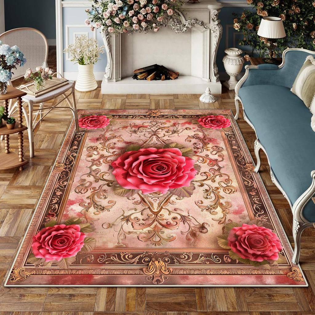 Europäischer Stil Rutschfest Großer Wohnzimmerteppich Blumendesign Raumdekoration Ästhetischer Schlafzimmerteppich Schminktischmatte Waschbar