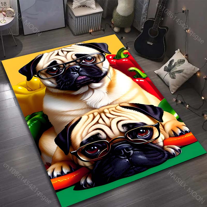 17 Stile Niedlicher Mops-Druck Teppich für Wohnzimmer Schlafzimmer Sofa Fußmatte Heimdekor Bereichsteppich Rutschfeste Bodenmatte Große Größe
