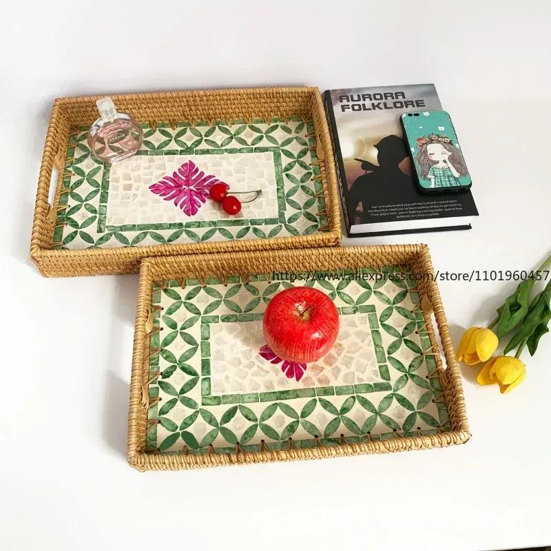 Rechteckiger Naturmuschel Rattan Korb Kreatives Rattan Aufbewahrungstablett Bunter Muschel Aufbewahrungskorb Obstschale Heim Organizer