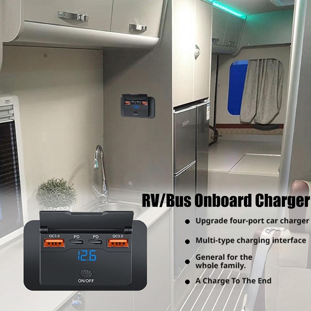 12-24V 4-Ports Car USB Charger Socket Adapter 108W USB C Outlet Panel Wall Mount with LED Voltmeter for Bus RV Boat Car Truck