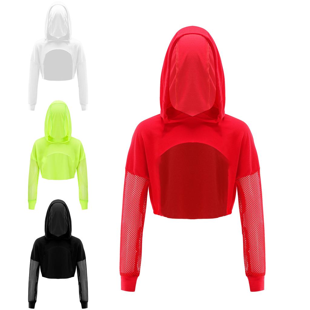 Herbst Winter Kinder Mädchen Mesh Patchwork Crop Top Kordelzug Kapuzenpullover Durchsichtig Langarm Hoodie Tanktop Tanz Bühnenauftritt