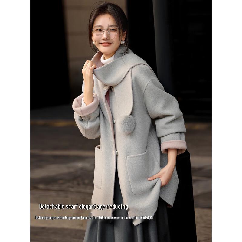XWI Women's Detachable Scarf Double-Faced Wool Coat