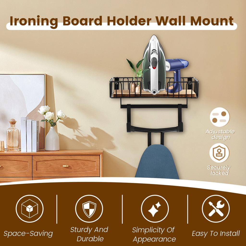 Ironing Board Hanger Wall Mount Ironing and Iron Board Hanger with Wood Storage Base Hooks Multifunctional Storage Holder Home
