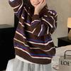 Vintage Kontrastfarben Strickpullover Herbst Winter Neue Gestreifte Damenbekleidung Polokragen Knopf Locker Pullover