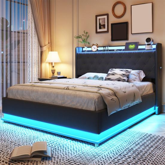 LED Polsterbett 140x200cm mit USB-Ladeanschluss und hydraulischem Stauraum, hautfreundlicher Leinenstoff Grau