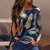 Damen Modisch Lässig Hals Langarm Saum Schlitz Karneval Print T-Shirt Top