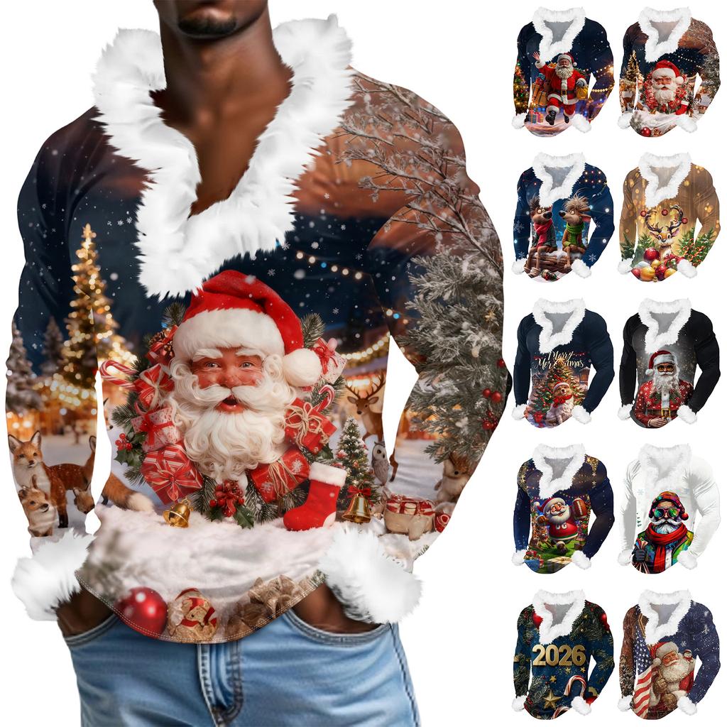 Herren Lässiges Weihnachten Bedrucktes Plüsch V-Ausschnitt und Fleece Langarm-Sweatshirt