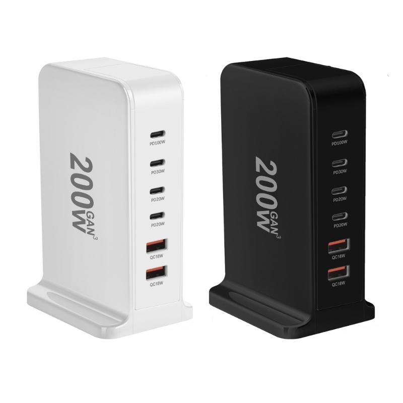 Ausgestattet mit 4 USB-C-Schnittstellen und 2 USB-Schnittstellen. Die Gesamtleistung kann 200 W erreichen.. Es kann die gleichzeitige Aufladung von 6 Geräten ermöglichen..