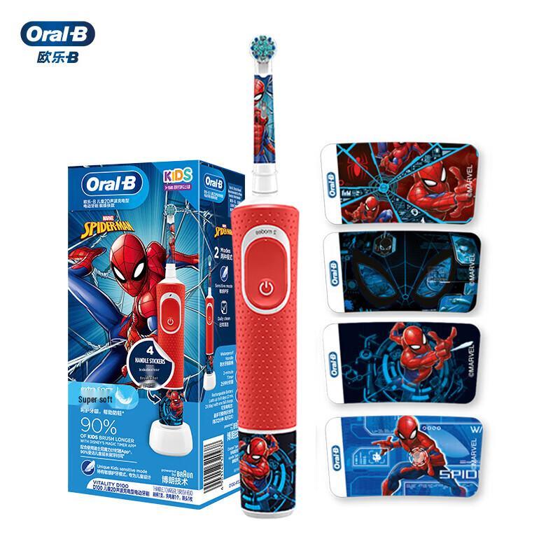 Designed for children aged 3-7 years, the Oral-B D100K Kids Electric Toothbrush features a fun Spider-Man theme. This sonic toothbrush offers gentle yet effective cleaning for primary teeth with two modes: Gum Care and Clean. It comes with a small round brush head made of nylon bristles, inductive charging, and up to 30 days of battery life. The set includes a gift box and a travel case, making it perfect for personal care or as a gift.