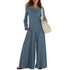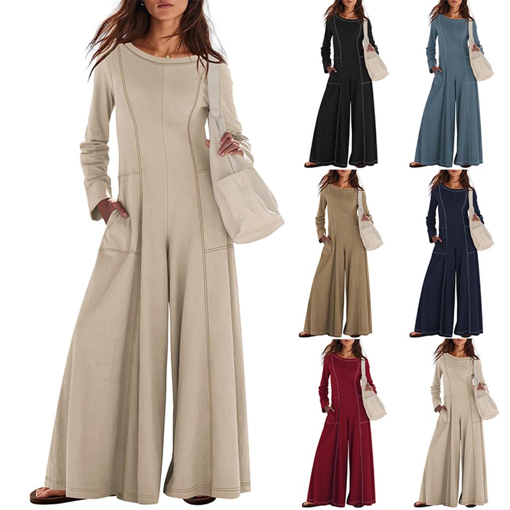 Damen Modischer Lässiger Rundhals Langarm Tasche Lässiger Lockerer Weitbeiniger Jumpsuit