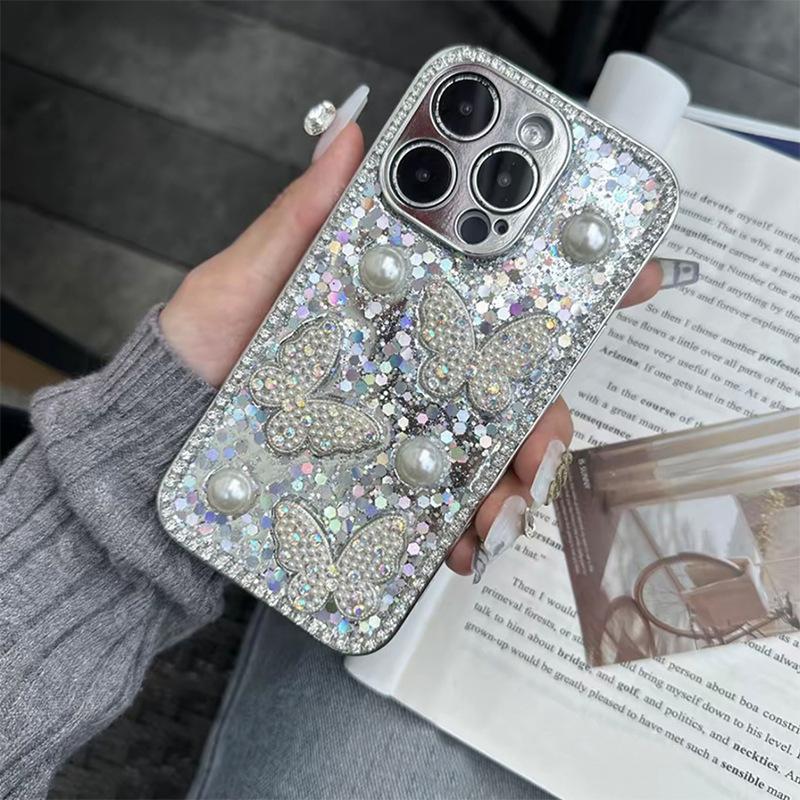 Klebe Pailletten Perle Schmetterling Handyhülle für IPhone17promax Feines Loch Linse Sturzsicher für Apple 16 Weiblich