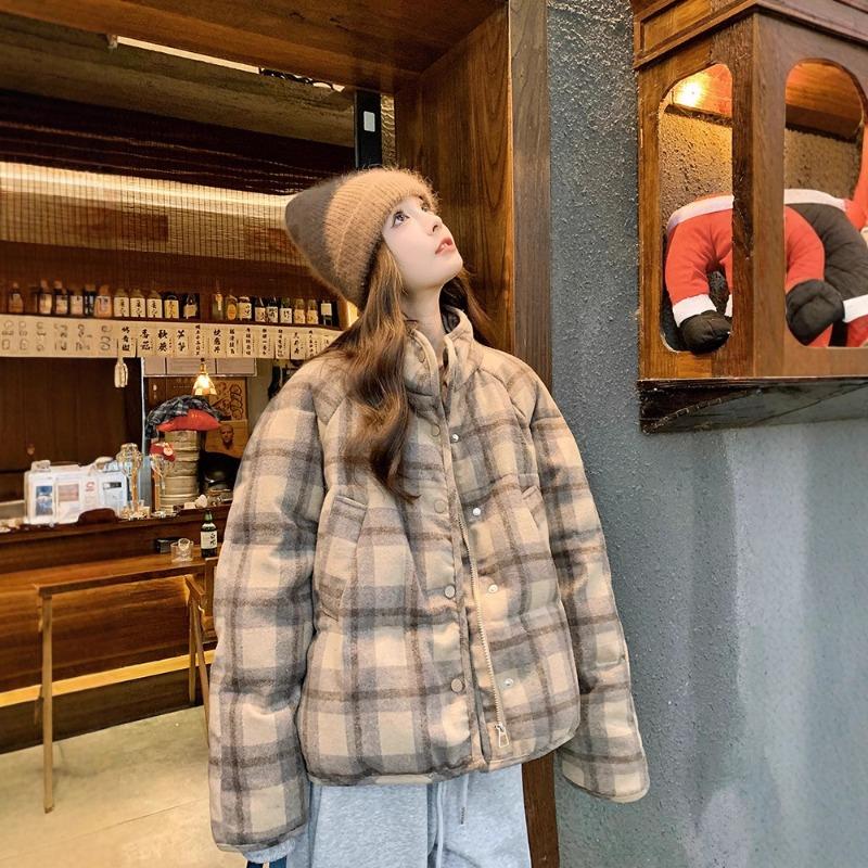 Classic plaid casual loose brown plaid stand-up jacket autumn street style long-sleeved women's clothing