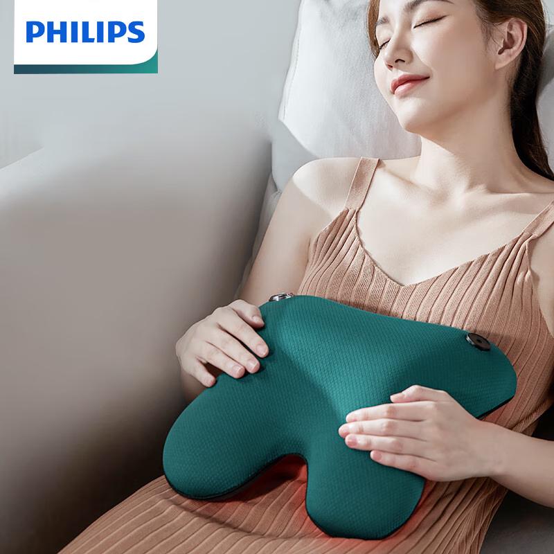 Experience soothing relief with the Philips Neck and Back Massage Pillow. Featuring imitation human hand kneading and a comforting hot compress function, this versatile massager is designed for home use. Its portable, cordless design with a built-in lithium battery allows for relaxation anywhere, anytime. Ideal for targeting the neck, shoulders, back, and waist.