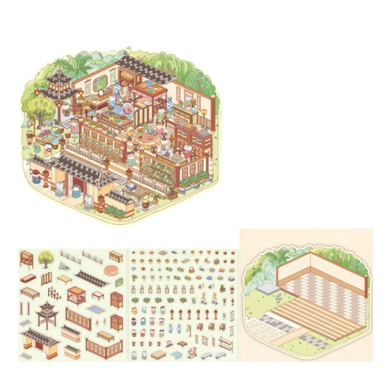 3D Szenenaufkleber Chinesischer Stil Landschaftsaufkleber Katzenhütte Handkontoaufkleber Etiketten Journaling-Zubehör