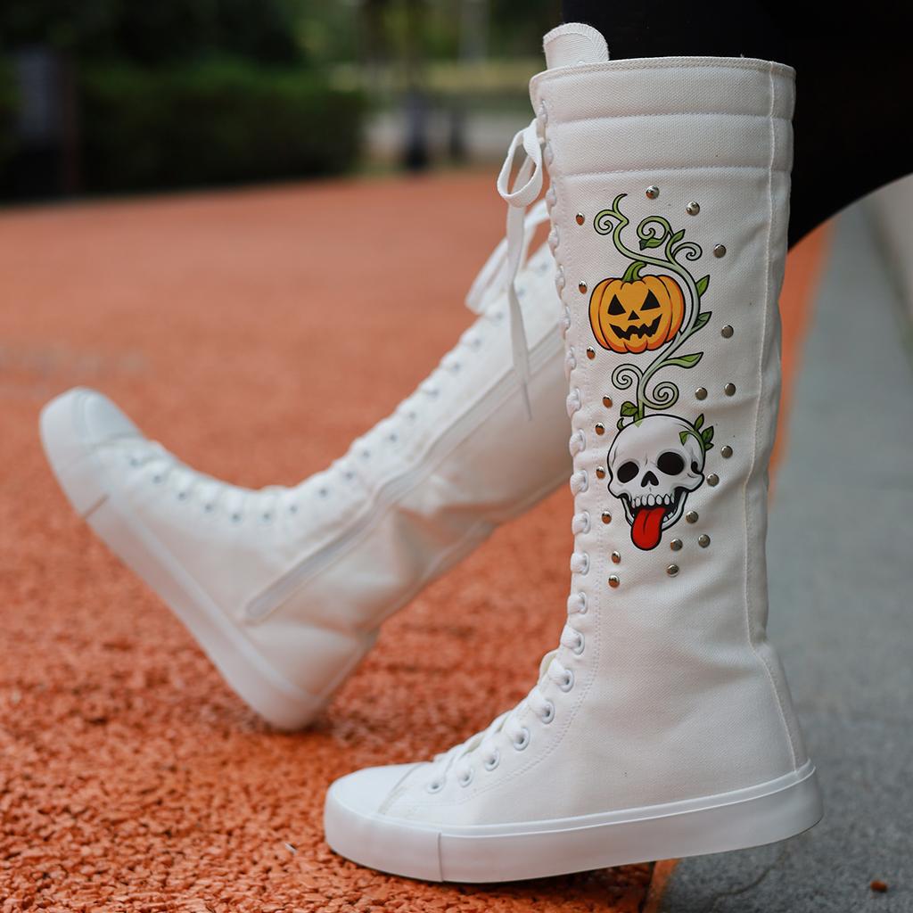 1 Paar lange Damen-Canvas-Stiefel bis zum Knie, Halloween- und Nietenverzierung an der Außenseite, Reißverschluss an der Innenseite, modische flache hohe Stiefel