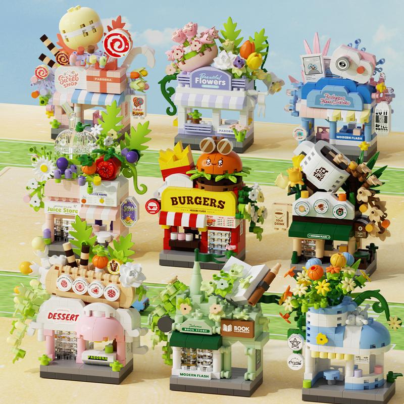 Mini Street View Kaffee Fotostudio Haustier Brot Dessert Blume Hamburger Kleine Läden Stadt Bausteine Für Kinder Spielzeug Geschenke