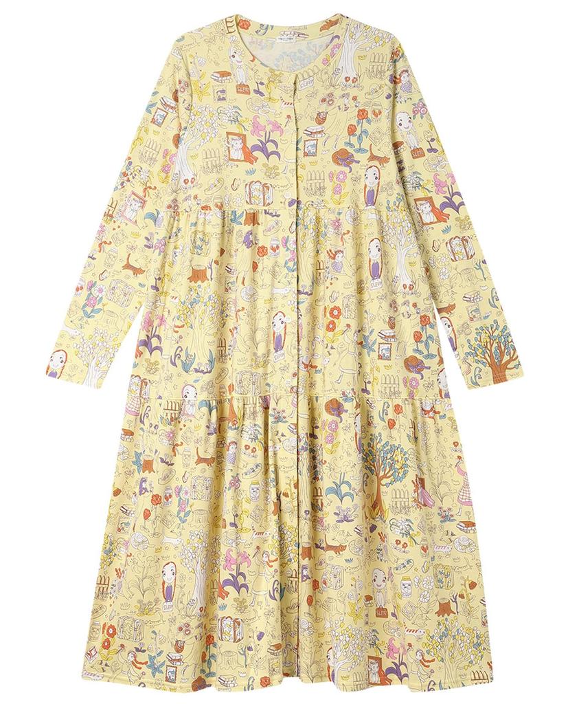 A three-tiered dress with a pattern depicting a girl relaxing and strolling through the forest.