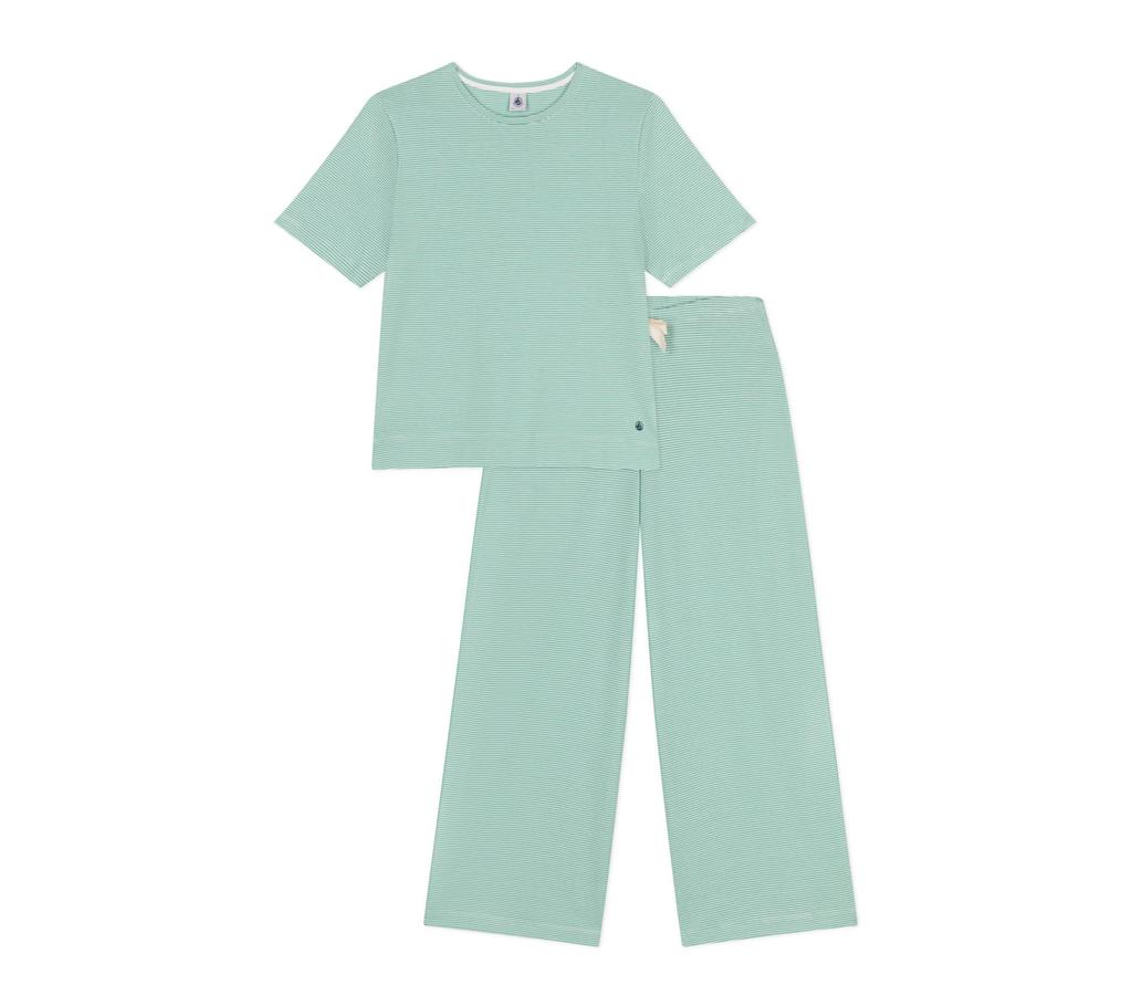 These short-sleeved, long-pants pajamas, available exclusively at the online boutique, feature Petit Bateau's signature ultra-fine Mirale stripes. Crafted from eco-friendly organic cotton and a 1x1 rib knit so soft it feels like a second skin, they offer a natural feel. A brand logo at the hem and a thick drawstring add a touch of style to the design. This is a recommended item for comfortable wear, from relaxing at home to bedtime. Note: Dark colors may fade or transfer color when rubbed or washed. Wash separately with a mild detergent.