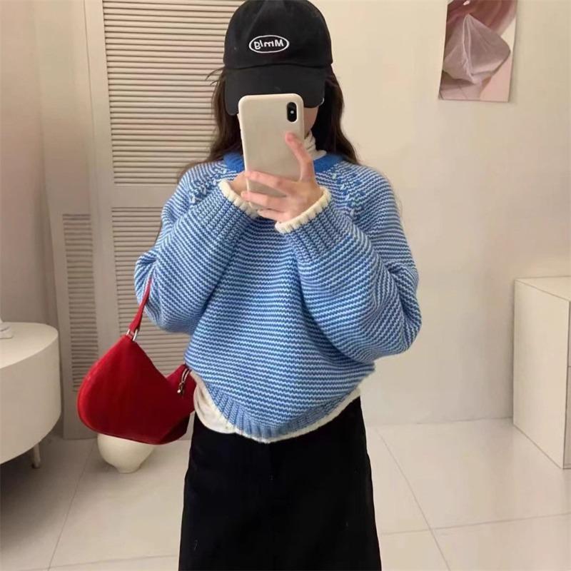 Fauler Retro-Gestreifter Pullover Damen Herbst und Winter Locker Kleiner Rundhals Gestricktes Oberteil