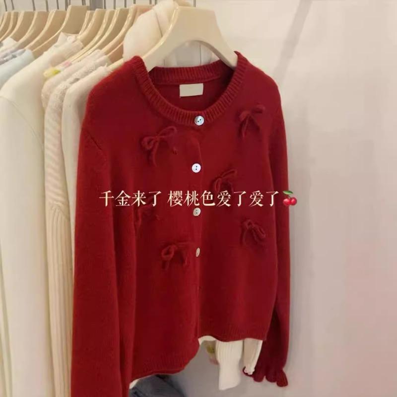 Roter Strickcardigan mit Schleife Damen Frühling und Herbst Design-Sinn Nische Retro Dünne Strickjacke Kurz