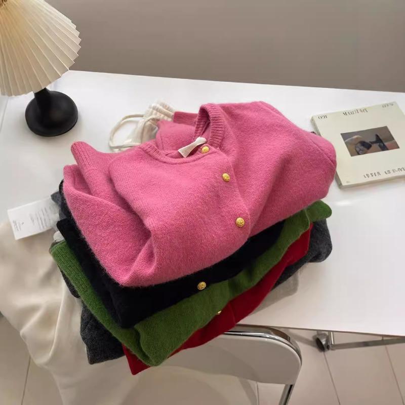 White raspberry powder small gold buckle knitted cardigan for women! Autumn and winter soft waxy thickened warm crew neck sweater jacket