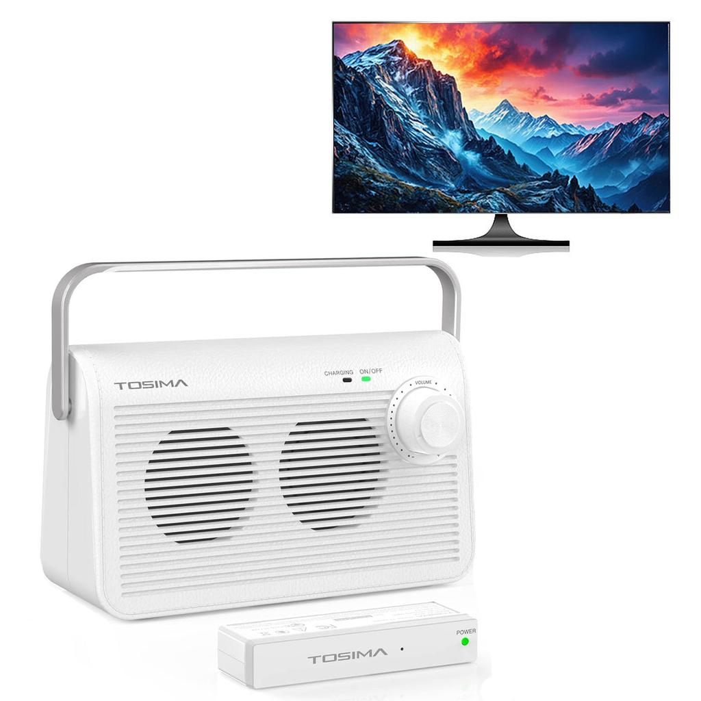 TosimaTV Wireless Handheld TV Speaker for 30m 920MHz Easy Volume Control Seniors, Transmission, Band, Rechargeable, Ear-Mounted, (White) (TV-9000)