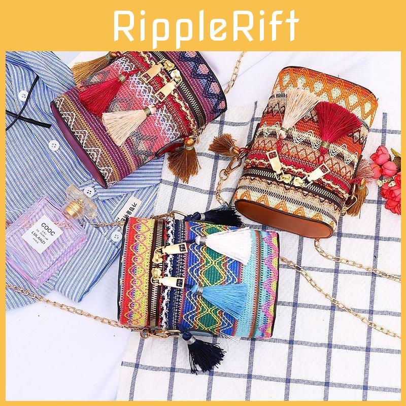 Bohemian Fashion Colorful Woven Texture Bucket Bag With Tassel Accents And Certificate Pocket For Casual Outings
