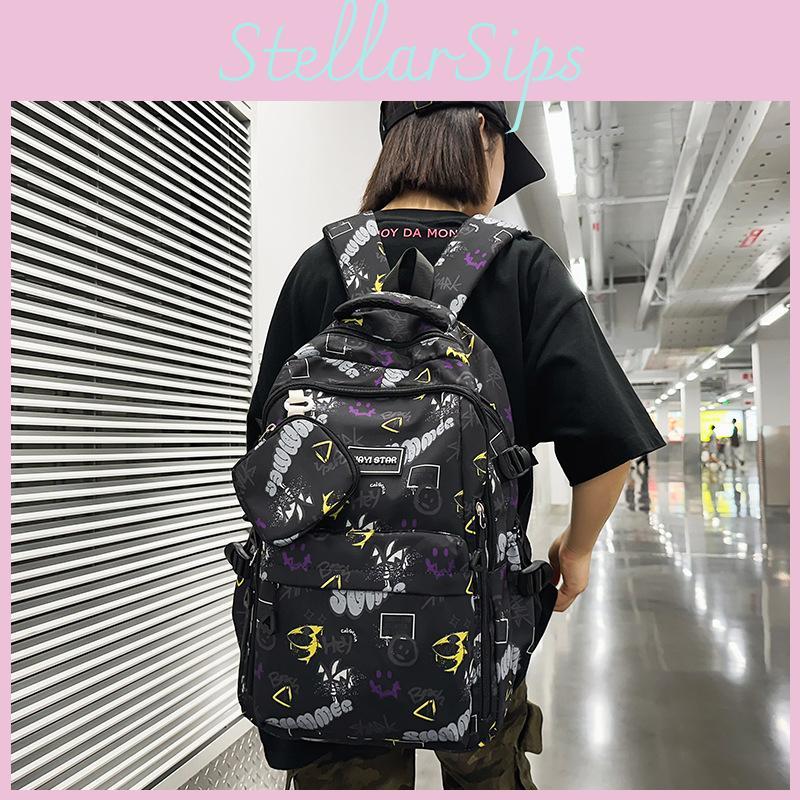 This fashion-forward graffiti-style backpack features a lightweight nylon construction with breathable, durable materials.it offers ample space for daily essentials. The padded air cushion shoulder straps provide comfortable carrying.Suitable for high school students and daily school use, this versatile backpack showcases bold letter patterns and trendy stitching details. Its polyester lining enhances durability, while the moisture-wicking design ensures comfort during extended wear. Wipe clean with a damp cloth to maintain its vibrant appearance.