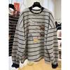 Retro Lockerer Gestreifter Cartoon-Druck Fleece-Pullover Hoodie für Damen Herbst und Winter Neuer Rundhalsmantel