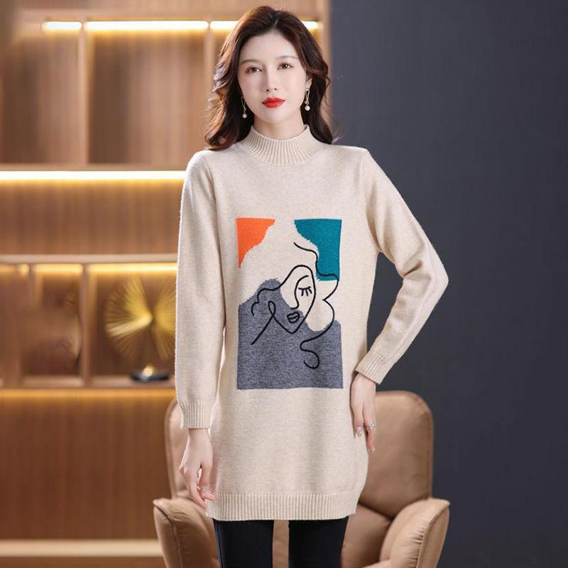 Kleid für Frau Baumwolle Winter Warm Rundhals Langarm Vintage Lässig Bedruckt Lang Stretch Strickpulloverkleider