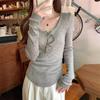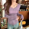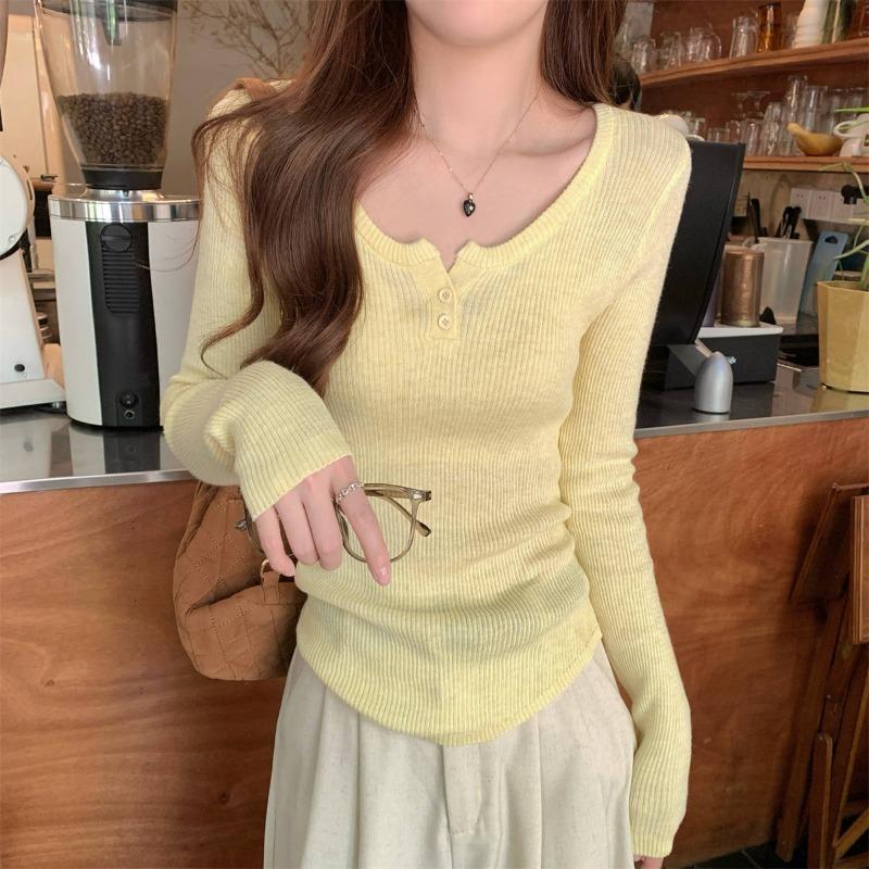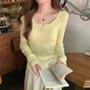 Early spring girly tender yellow knitted bottoming shirt women's button front shoulder sweater long-sleeved top