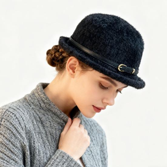 Bleiben Sie warm und stilvoll mit unserer Beckenmütze aus plüschigem Stoffmaterial für ganztägigen Komfort.. Das schlichte, aber elegante Design verfügt über eine zarte Gürtelschnalle, die Ihrem Look einen Hauch von Retro-Charme verleiiht..